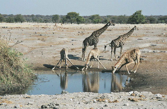 La girafe ; quel animal gracieux… sauf peut-être quand elle doit se désaltérer.