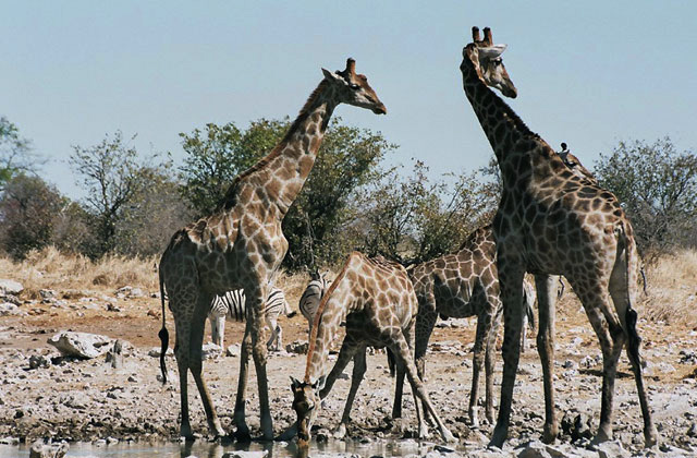 La girafe ; quel animal gracieux… sauf peut-être quand elle doit se désaltérer.
