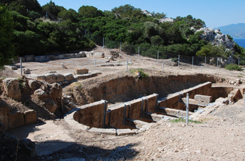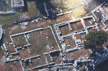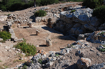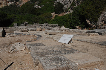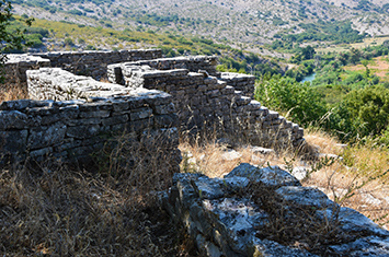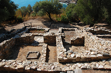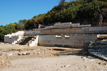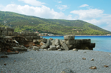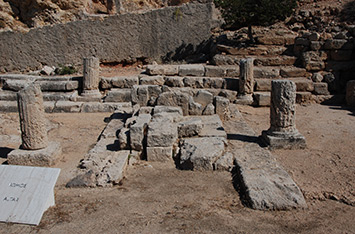 Les plus intéressants sont les vestiges, en grande partie préservés, d’un hôtel de ville nommé Katagogion. Il était construit sur un plan carré, sur deux étages, possédait 17 chambres autour d'une cour entourée de portiques soutenus par des colonnes à 8 côtés. Derrière l'hôtel, une grande rue pavée mène à la partie supérieure de la ville. Il y avait aussi un théâtre, au-dessus de la ville, avec vue sur la mer, et un temple dédié à Aphrodite en dehors des murs - mal conservés aujourd'hui. |