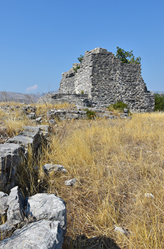 | Les ruines pittoresques d'une mosquée avec le contour du bâtiment et les arcades proviennent de la période de l'occupation turque au XVe siècle. La mosaïque de nombreux fragments des murs de plusieurs bâtiments, visibles sur la colline, témoigne de la population séculaire et des nombreuses reconstitutions de la ville. | |