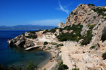 Le sanctuaire de la déesse Héra a été fondé au 9ème s. av. JC. sur la rive d'une charmante petite baie encadrée par une pente rocheuse, face à Corinthe. Il a été détruit par les légions romaines en 146 av. Il y avait plusieurs bâtiments dont il ne reste que des ruines : un portique (stoa) en forme de L, à deux niveaux, d’une construction atypique - les colonnes au rez-de-chaussée étaient doriques, et à l'étage supérieur ioniques, des fragments de ceux-ci sont conservés, l’autel sacrificiel de 2,5 x 4 m en blocs de pierre couvert par le toit soutenu par 4 petites colonnes cannelées de style ionique, les ruines derrière lui viennent du temple primitif d'Héra, le nouveau grand temple de la déesse Héra Akrai était rectangulaire (30 m x 10 m), avait un toit en marbre et trois bas-côtés, ce qui à cette époque était exceptionnel. Une place entourée d’une colonnade, accolée à la roche, servait probablement d’agora. |