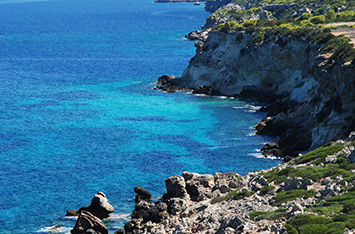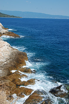 | C’est aussi près de ce lieu qu’on trouve le point le plus profond de la mer Méditerranée (4850 m.). Sur un monticule demeurent les ruines d’un ancien temple dédié à Poséidon où officiait jadis une Pythie locale. L’édifice fut ensuite converti en chapelle chrétienne, dont subsiste aujourd’hui un petit autel à vocation bien plus œcuménique. Tous les « pèlerins » peuvent y laisser des offrandes, et inscrire sur un livre d’or leurs impressions et récits de voyage. Au XVIIe s. le cap et ses lagunes constituèrent un abri confortable pour les pirates. Il en reste un petit port abritant quelques barques de pêcheurs, une plage de galets, et plus haut une accueillante « taverna ». | ![]() |