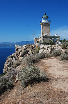 CAP IREO de PETRACHORA Le cap Heraion est situé à 20 km au nord de Corinthe. Sa haute côte rocheuse est entourée par les eaux bleues de la baie. Pendant des siècles un phare servait à l'orientation des marins. De là on peut voir : au nord - les rives sud de la Grèce centrale, au sud – la côte nord du Péloponnèse. |