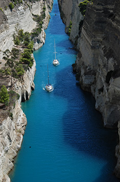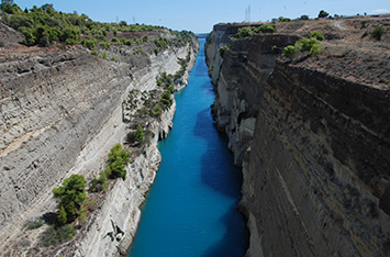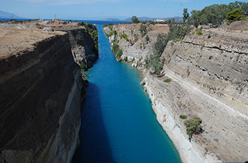 ISTHME Le canal de Corinthe relie la mer Égée à la mer Ionienne à travers la baie de Corinthe, séparant le Péloponnèse du continent. L'idée de sa conception fut décidée dans l'Antiquité par Néron, qui inaugura sa construction, par le travail forcé de 6000 esclaves, avec une pelle dorée. L'empereur mourut un an plus tard et le travail a été interrompu. Les travaux ne reprirent qu’en 1882, mais furent bientôt stoppés. Le canal n’a été achevé qu’en 1894. |