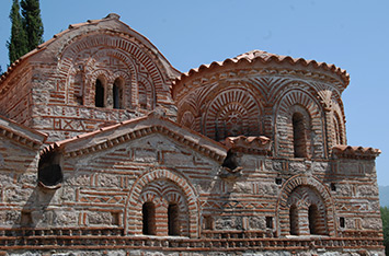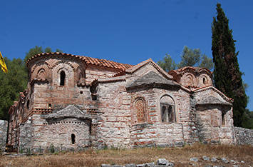 GARDENITSA Village étendu, parcouru de ruelles sinueuses qui serpentent entre de vieilles maisons, certaines abandonnées, et d’autres reconverties en résidences d’été ; et la petite église Agios Sotir, du XIIe s., pourvue d’une abside et d’un narthex que supportent de fines colonnes en marbre. L’abside est décorée d’étranges fresques de briques aux motifs rappelant l’écriture coufique. Et l’intérieur abrite des fresques du XIVe. s. |