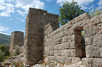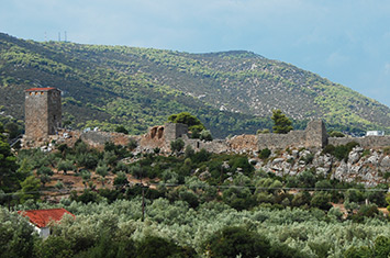 | Construit au sommet d'une colline s'élevant à pic, dans un coude de la rivière Kalamos, bien caché dans le terrain, il est accessible par la route depuis Parapotamos. Les bâtiments les plus anciens, datant du IIe siècle av. J.C., lorsque les Romains s'emparèrent de la ville, sont : la porte d'entrée principale entre deux massives tours carrées et une autre tour, plus haute, également carrée. Les vestiges de l'église et de vastes murs de la ville datent de la période byzantine, ainsi que la plus haute tour de plan carré, avec une entrée à la hauteur du deuxième étage pour renforcer ses défenses. | |