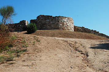 Elle était entourée par des murs massifs renforcés par des tours faites de gros blocs de pierre. Ils descendaient jusqu’à la mer. La citadelle, bâtie sur la colline haute de 400 m, possedait de nombreuses tours élevées de plusieurs dizaines de mètres. Elles permettaient l'observation du mouvement des navires en mer et la surveillance de la route vers Athènes. Jusqu’à notre époque ont survécu 16 de ces tours ; dont 8 sur la citadelle. Ce sont les plus hautes tours de la Grèce antique qui ont traversé les siècles en position verticale. |