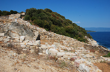 Au Ve s. av. JC elle a été conquise par le roi perse Xerxès. Plus tard Stagira a pris part dans la guerre entre les cités grecques Athènes et Sparte. Au milieu du IVe s. av. JC, Philippe de Macédoine la détruisit, mais après quelques années, reconstruite et agrandie en l’honneur du précepteur de son fils. Stagira occupait un haut promontoire rocheux s’avançant dans la mer. Des épais murs renforcés par des tours encerclaient la ville, descendant jusqu’au niveau de l'eau. Le centre de la vie publique était l'agora, il en est resté le long portique avec les bases des colonnes. A proximité, les travaux archéologiques ont permis de découvrir les fondations des résidences au long de la rue qui descend sur la pente. En 2016, on y a découvert la tombe d'Aristote, dans un bâtiment qui ressemble à une chapelle. Dans la partie la plus avancée du promontoire dans la mer, il y avait un temple de la déesse Déméter. |