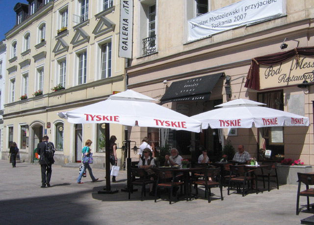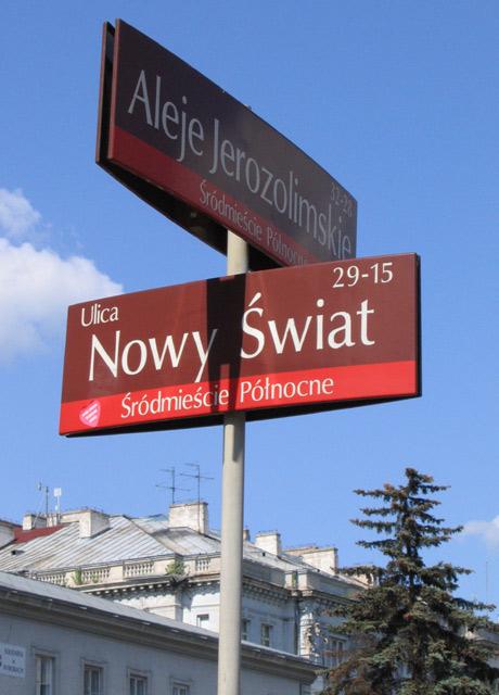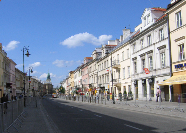 | Krakowskie Przedmiesce, qu'on pourrait traduire par « faubourg de Cracovie », est l'artère importante qui mène à Nowy Swiat (nouveau monde) qui la prolonge, la rue où se côtoient bars, restaurants, boutiques de luxe, librairies, magasins d'art ; un peu le « faubourg saint-Honoré » de Varsovie. | ||
