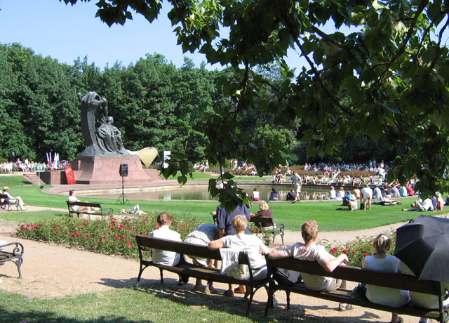 | Park Lazienki : lieu de promenade, bucolique et tranquille, dans le quartier des ambassades et proche de la résidence du chef de l'état, appelée le belvédère. A ne pas manquer : tous les dimanches après midi y est donné un concert de piano gratuit en plein air où sont jouées les œuvres de Chopin, au pied de la colossale statue dédiée au compositeur. Le monument, détruit par les nazis, a été reconstruit après la guerre. | ||