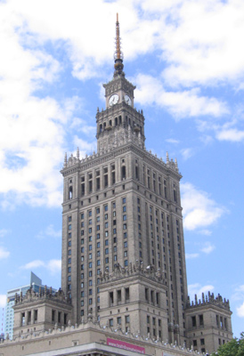 | La période communiste, qui dura de l'après-guerre jusqu'à l'effondrement du bloc de l'est (n'oublions pas que la coalition qui s'opposait à l'OTAN lors de la guerre froide se nommait « pacte de Varsovie ») a aussi laissé une empreinte très forte sur la ville, dont le plus emblématique exemple est le palais de la culture et des sciences (Palac kultury i nauki) ; ce bâtiment qui se dresse au centre de la cité, don de l'URSS à la Pologne, est à l'image d'édifices semblables construits à Moscou. | ||