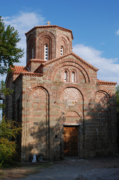 De forme ramassée, elle est construite de blocs de pierres, et de briques rouges et plates disposées de manière décorative autour des hautes fenêtres et formant un ornement original. Quatre tourelles autour de la tour principale recouverte d’une coupole apportent une certaine élégance à la construction. Jadis, l’édifice était entouré de bâtiments d’habitation pour les moines. À l’intérieur, tous les murs sont ornés de fresques datant des années 1313-1318, très bien conservées, sorties des mains de deux peintres : Eftihiej, et Mikhail Astropov qui travailla aussi à Ohrid. |
