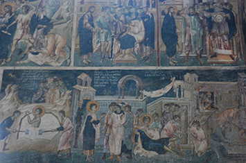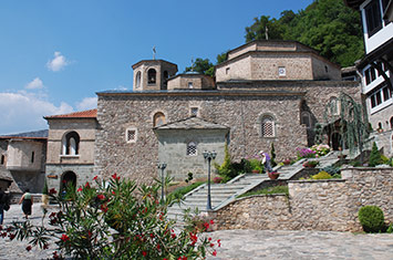 De la route d’accès, en contrebas de l’édifice, l’édifice donne l’impression d’un château moyenâgeux protégé par de hauts murs qui soutiennent l’église et les nombreux bâtiments attenants. Au-delà de l’imposant portail d’entrée, on traverse la cour pourvue d’un puits à l’eau « miraculeuse », on passe à côté du petit magasin de souvenirs religieux, puis on monte les marches d’un escalier de pierres qui mène à une galerie couverte de fresques conduisant à l’entrée de l’église. À l’intérieur, on est frappé par la grande iconostase en bois sculpté, aux colonnes ajourées décorées de scènes bibliques, d’une foule de personnages et d’animaux, d’ornements végétaux, qui délimitent les sections du large panneau orné de multiples icones de tailles différentes. C’est la plus précieuse iconostase de Macédoine, dont la construction a nécessité le travail de deux sculpteurs pendant plusieurs années. Devant elle, sur un piédestal, est déposée une icone représentant le saint auquel est consacrée l’église, datée de 1020, recouverte au XIXe s. d’une « robe d’argent », à laquelle on prête des pouvoirs surnaturels. Elle est considérée comme la plus ancienne du pays. Les murs de l’église sont peints de fresques, les plus précieuses se trouvant dans la coupole. |