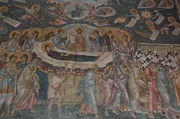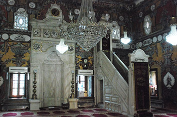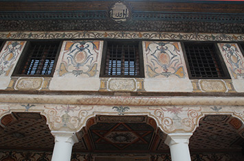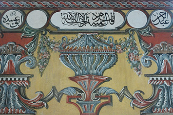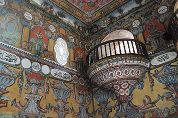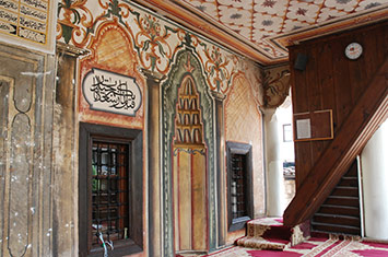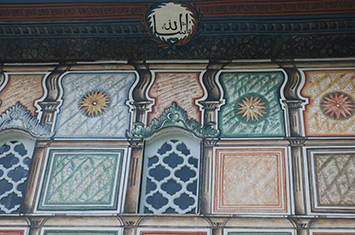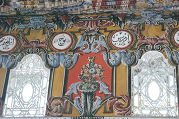 L’intérieur est encore plus surprenant ; les parois sont ornées de motifs floraux entrelacés, de vases de fleurs, d’inscriptions en caractères arabes ; et, fait très rarement présent dans l’iconographie religieuse, de vues des villes et des mosquées principales de l’empire ottoman, ainsi surtout que de la ville sainte de l’Islam, la Mecque, et la pierre sacrée de la Kaaba. Le fond, peint de couleurs, principalement jaunes, bordeaux, et brunes, confère au bâtiment une atmosphère chaude et agréable. |