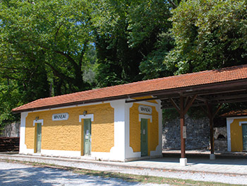 La storica stazione ferroviaria, che si trova sotto la città, è il punto di partenza d’un sentiero lastricato al plazza centrale di villagio. |
