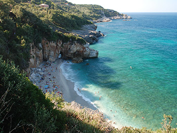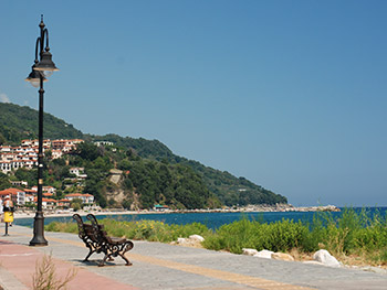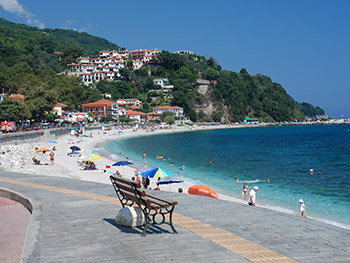 MILOPOTAMOS Accessibile dalla strada tortuosa da Tsagarada, ha una famosa spiaggia sulla riva rocciosa rivolta verso est. Dal parcheggio di fronte agli hotel, un sentiero conduce, a poche decine di metri fino alla costa, attraverso una pineta, passando vicino l'accogliente ristorante. L'attrazione del luogo è la roccia, visibile dal belvedere, da cui temerari possono saltare in acqua color smeraldo. Il luogo ideale per trascorrere una giornata di dolce far niente con una nuotata e un buon mangiata. |