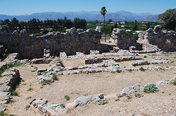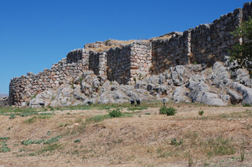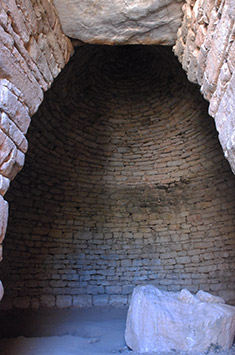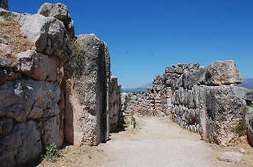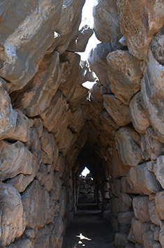 il tunnel di casematta | Le mura ancora visibili data del XIV s. a.C. (lo stesso momento in cui anche la città Micene è stata costruita), hanno circondato e protetto il palazzo del re. Nel corso dei secoli successivi il castello fu ampliato e il palazzo divenne più spazioso, arricchita da un portico decorato con placche di alabastro e affreschi, e avendo un bagno. Le fortificazioni sono state dotate di casematte, allergate al nord fino a fornire un riparo per le persone in caso di un attacco nemico. Le pareti misurarono su 9 m di altezza (ora 7 m), con una larghezza media di 6 m! Nella parte in cui sono disposti le casematte, raggiunge 17 m. Tirinto è stata completamente abbandonata nel V s. d.C. e svuotata dei suoi abitanti. Gli scavi archeologici, iniziati nel 1884 dallo scopritore di Micene, il famoso H. Schliemann si estendono fino ad oggi. |