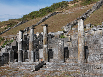 ANTIGONEA Vecchia città greca del IIIe s. prima della nostra era, la più importante della valle dello Drina. Fu distrutta 150 anni più tardi dai Romani e mai ricostruita dopo. Queste rovine vecchie si trovano ad una ventina di km all'est di Gjirokaster. Ci si ha aggiornato dei frammenti della parete di recinto con tre torri che circonda la città sul 4 km e le rovine delle due porte d'entrata. Il piano della città, delle vie, dei negozi e delle residenze, è ancora molto visibile. Soprattutto al posto dove una via è stata liberata, e delle colonne ricostituite alla verticale. Le rovine visibili rappresentano finora soltanto una piccola parte della città che si estendeva su tutta la pianura. Nel 2007 fu organizzato a Antigonea un festival di vecchi riti pagani; in questa occasione la piccola strada che curva nella montagna fino al terreno di scavi fu asfaltata. |