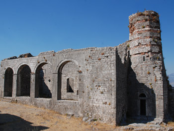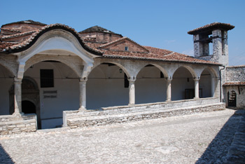 Fuori dalle mura, sul lato del nord, si trova la chiesa della Trinità (XIII - XIV secolo), che possiede una bella decorazione in mattoni rossi attorno alle finestre ed affreschi interessanti. Sul pendio ripido sospeso sul fiume Osum è sospesa la piccola chiesa di San Nicola, con una bella vista della passeggiata che costeggia il fiume. A In origine le mura di Kala contenevano due moschee, “la bianca„ e “la rossa„. Oggi, restano soltanto le rovine. Nel quartiere Mangalem, situato in basso, si trovano alcune moschee: la moschea del sultano, del XV secolo, costruzione con interessante tetto in stile locale composto da piastrelle e legno; inoltre possiede grandi portici e numerose finestre che illuminanano la sala della preghiera. Dentro, il mihrab ed il mimbar sono completamente decorati e le pareti coperte da un affresco del XVIII secolo con motivi floreali. Gli edifici storici che la circondano presentano un piccolo lapidarium sotto i portici. Vicino alla piazza centrale della città, accanto alla chiesa moderna in stile bizantino, si potrà vedere la vecchia “Moschea di piombo„, del XVI secolo, così denominata a causa della sua cupola rivestita di questo metallo. |