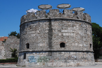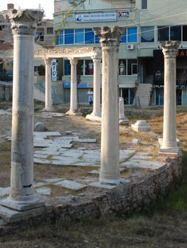 | Nonostante le guerre ed i tremiti di terra, la città conservò alcuni resti di monumenti vecchi; al centro, fra le abitazioni moderne, è stata aggiornata un forum che data del Ve-VIe secolo, alle colonne slanciate; più lontano si ergono le alte pareti di fortificazione della città bizantina del VI secolo, i resti di un castello e di una torre d'epoca veneziana, pareti di recinto veneziane e turche (XVe - XVIe secolo), predominate dalle rovine del teatro ellittico del IIe secolo davanti C. che poteva accogliere 18.000 spettatori. La maggior parte non è stata ancora scavata; le tribune hanno perso le loro lastre, ma è possibile circolare nelle gallerie scoperto, che fungevano da corridori per l'accesso dei gladiatori e dei animali selvatici. |