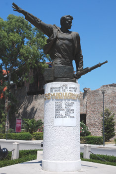 Gjegi Kastrioti, conosciuto come Skanderbeg, l'eroe nazionale del XV s., che ha condotto battaglie contro i turchi, ha monumenti in molte città dell'Albania. Figlio di un dirigente locale, è nato nel 1405 a Lezha. Turchi, i conquistatori europei, ha imposto un tributo al padre esigendo che quattro di sui figli sono presi in ostaggio in pegno di fedeltà (1423). Uno di loro, Skanderbeg, abitava nella corte del sultano ottomano. Ha imparato la loro fede, i loro costumi, e principi dell'arte militare. Accanto l'esercito turco, è stato nominato Bey. Dopo la morte di suo padre, ha lasciato il Sultano e tornò in Albania con una squadra di suoi concittadini a combattere contro i Turchi. La sua prima vittoria fu la conquista di Kruja, dove ha appeso la sua ancestrale bandiera - nero aquila bicipite su uno sfondo rosso divenne la bandiera nazionale del paese - sulla fortezza. Nel 1444, ha fondato la Lega dei principi albanesi a Lezhë per la lotta comune contro l'aggressore turco. Per oltre 20 anni, i turchi non