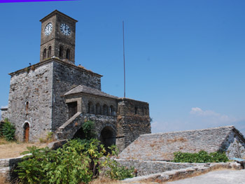 GJIROKASTER Questa città-museo è situata nel sud dell'Albania, non lontano dalla frontiera greca (30 km). La fortezza, del XIII-XIV secoli, che predomina il paesaggio, proteggeva la valle del fiume Drinos (Dropoli), grazie ai suoi alti muri che comportano 5 torri e 3 grandi porte d'entrata. È stata aumentata e prolungata verso il sud da Ali Pacha, il dirigente otomano della provincia, all'inizio del XIX secolo, decorata di una tore d'orologio, e fornito di un acquedotto lungo di 10 km che alimentava in acqua i serbatoi sotterranei. Le gallerie incurvate della fortezza riparano un museo di armi di varie epoche ed un'esposizione di materiale di guerra e di pezzi d'artiglieria della prima metà del XX s. |