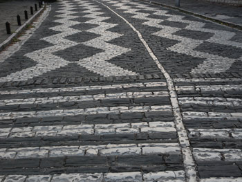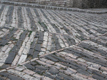 Le viuzze anche sono lastricate di pietre grigie, bianche e rosse che formano disegni geometrici, e bordate di marciapiedi in scale. Ciò che dà alla città un aspetto indimenticabile, che ricorda l'epoca ottomana. |