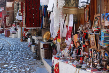 La via che conduce della città alla citadelle ha l'aspetto di un bazar orientale dove, su bancarelle e nei negozi, sono proposti ai turisti: “kilims„ ai colori vivi, oggetti artigianali in legno ed in rame, tessuti vecchi, attrezzi tradizionali d'impiego quotidiano, vecchume, ed ogni specie di ricordi. |