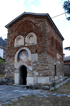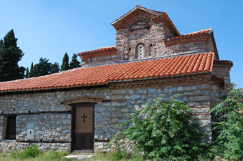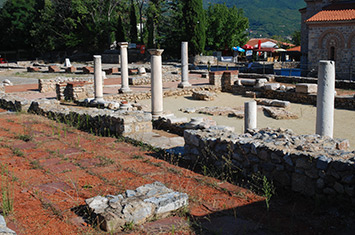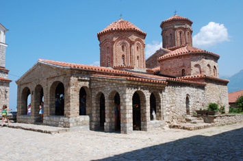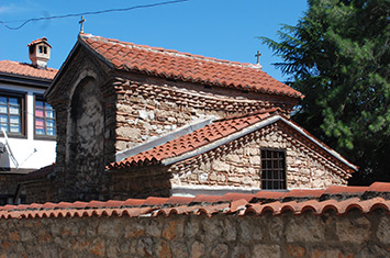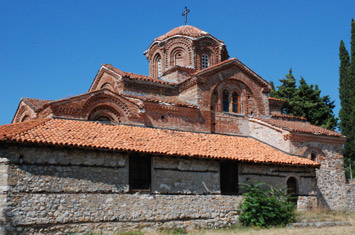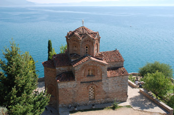 | Il più vecchio edificio della città è la basilica Santa Sofia (XI s.) decorata di due alti torre e di una galleria aperta su un lato. È stata aumentata alla XIV secolo, trasformata in moschea dagli ottomani, ed i suoi affreschi sono stati mantenuti grazie alla protezione che ha garantito loro il pittura alla calce effettuato dagli occupanti turchi! Nella piazza adiacente, si possono vedere le tartarughe che vi abitano in libertà. | La chiesa San Jovan Kaneo, appollaiata sui bordi brusco e pittoreschi del lago, contiene i resti di un affresco del XV secolo.