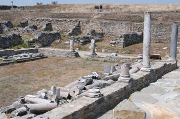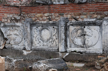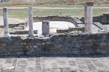 Più lontano erano i terme. Sul bordo della via principale si trovavano due basiliche (IV- VI secolo) nella più grande, a tre navate con un ampio narthex, sono ancora visibili dei fondi battesimali e delle tombe slave. La seconda era costruita sulle pareti di una sinagoga precedente. Di un'epoca più tardiva provengono, meglio conservati, i resti della basilica episcopale, ed il suo battistero decorato di bei mosaici alle temi di fauna e flora. |