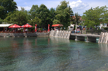 | Il chiostro che circonda la chiesa è stato cambiato al secolo scorso per fare un hotel di lusso. Più sotto, su una piccola isola allegata dal fiume che si getta a grande rumore nel lago, c'è un ristorante elegante, le cui tavole sull'erba sono riparate da vecchi alberi. Si possono fare escursioni in barca. La strada che conduce del parcheggio sul prato alla chiesa passa fra numerose botege di commercianti di ricordi, di bar che servono da carne arrostita sulle tavole disposte dall'ampia spiaggia sul bordo del lago. Del piccolo porto si alla possibilità di partire in escursione sulle barche di qualsiasi dimensione. |