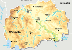 La capitale è Skopje. La superficie del paese è di 25700 km2. Conta un po'più di 2 milioni d' abitanti; di cui 67% sono costituiti da cristiani ortodossi, ed il 30% musulmani. La lingua è slava e s' scritto in caratteri cyrillichi. Macedonia divide le sue frontiere con: al sud con la Grecia, al nord con la Serbia e Monténégro, all'est con la Bulgaria, ed all'ovest con l'Albania. La montagna copre la più grande superficie del paese, con il vertice Korab (2753 m) alla frontiera albanese. Il paesaggio si decora di tre grandi laghi frontalieri, situati al sud: Ohrid, Prespa et Dorjan. Tre parchi nazionali, Mavrovo, Galicica e Pelister, occupano le regioni montagnose. Il più grande fiume, Vardar, 420 km, attraverse il paese. |