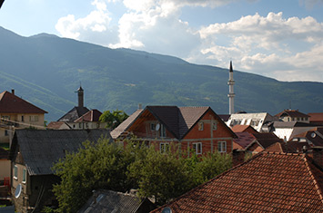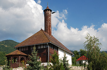 Molte moschee in stile regionale sono visibili anche in città e nei dintorni. La loro originale architettura del XVII e XVIII s., è caratterizzata da una struttura di legno e pietra, coperta con it tetto a quattro piste, dominata da minareti appoggiato direttamente sul tetto. Quest'ultimo, coperto con panelli di legno disposte a spina di pesce, sono decorate in alto con rilievi cinture che appaiono i simboli prevalentemente musulmano, luna e stella. Fontane abluzione adiacente a questi luoghi di culto sono coperti di tetti nello stesso stile. |