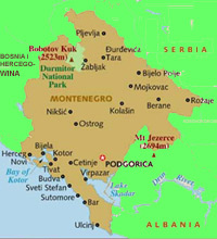Montenegro ha di una superficie di 13800 km2, conta 662.000 abitanti; la capitale è Podgorica. Ha le frontiere con, all'ovest la Croazia (15 km soltanto) e la Bosnia-Herzegovina, al nord la Serbia, all'est l'Albania ed il Kosovo, ed è delimitato al sud dal mare adriatico su una lunga costa di 293 km. Del paese, principalmente montagnosi, la maggior parte appartiene al massiccio delle Alpi dinariche; i più alti vertici, che superano 2500 m, si situano nelle catene di Durmitor e Procletije. Ci sono quattro parco nazionali: Lovcen, Durmitor e la valle di Tara, Biogradska Gora, ed il lago di Shkoder. La popolazione è costituita da montenegrini e di serbi e le religioni praticate sono l'ortodossia, l'islam, ed il cattolicisimo. |