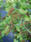 Liście dębowe są owalnie wydłużone, mają od 4 do 12 cm długości, kontur z wrębami, które różnią się wycięciem zależnie od gatunku. Liście zawsze osadzone są na krótkim ogonku. Owoce to żołędzie, umieszczone w płaskich miseczkach na szypułkach lub bezpośrednio na gałęzi. Jesienią, liście niektórych dębów przybierają kolor żółty lub czerwony. |