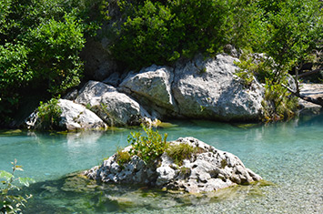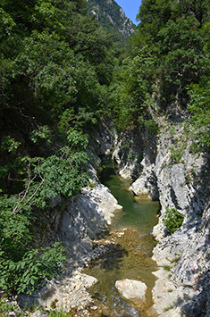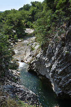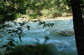 Odtąd rzeka przybiera swój typowy charakter górskiego potoku; przepływa głębokim wąwozem tworząc górski, wartki strumień o seledynowym kolorze, zasilany wodą z kilku kaskad spadających ze skalistych ścian. Aby isć dalej, trzeba zagłębić się w koryto piekielnie zimnej wody o nierównym, kamienistym i śliskim dnie. Rzeka szybko skręca i płynie najpierw na południe, po kilku kilometrach zawraca na północ. |