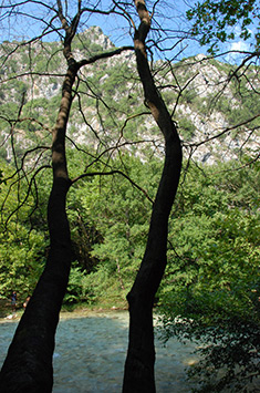 Śledząc nurt Acheronu pod prąd od Mezopotamos gdzie znajdował się starożytny Nekromantejon z salą do spotkań z duszami przodków i słynną wyrocznią dla Greków, trzeba przejechać brzegiem równiny, gdzie rzeka płynie leniwie rozlewając się w bagniste zakola lub, znika w podmokłym, płaskim terenie a przybiera formę rzeki przepływając przez Gliki (20 km). Urocze miejsce, ocienione wiekowymi platanami, szczególnie warte polecenia w upalny, letni dzień, nad wodą są restauracje, inne atrakcje to przejażdżki konne, rafting, stragany z miodami, ziołami i szlak pieszej wędrówki po okolicy,... Źródła Acheronu znajdują się dalej na wschód w widocznym na horyzoncie paśmie gór. |