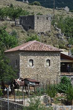 Niegdyś najważniejsze były cztery, w tym Samonida. Stanowiła w końcu XVIII w. najważniejszą osadą. Domy mieszkalne to były masywne, obronne, wysokie, czworoboczne wieże. Przetrwały do dziś częściowo zrujnowane lub przebudowane na nowoczesne domy, pozostaly też stare studnie w kamiennych obmurowaniach i trzy podziemne cysterny na wodę. Ponad Samonidą górują nad okolicą z 500-metrowego wzgórza ruiny zamku Kiafa. Wybudowali go Turcy na pocz. XIX w. aby łatwiej podporządkować sobie region. Zamek jest na planie wydłużonego czworoboku z dwoma narożnymi basztami sześciobocznymi i po jednej trójkątnej wzdłuż najdłuższych boków. Wieża z bramą wejściową znajduje się od strony Simonidy. |